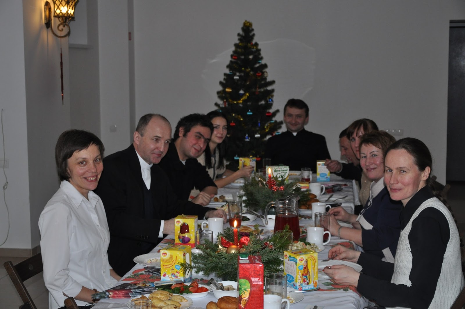 Wigilię zrobiliśmy w kościele, w salce pod kościołem. Bardzo się cieszę z tej wigilii, było nas chyba 10 osób, większość to ludzie, którzy niedawno znaleźli drogę do kościoła. Ktoś nieochrzczony, kto przyjechał z innego miasta, bezdomny, który ostatnio odśnieża nam wejście do kościoła, kobieta, która jakiś czas chodzi do kościoła i przygotowuje się do przyjęcia do kościoła i do pierwszej spowiedzi i Komunii św. choć nikt z jej rodziny o tym nie wie, dziewczyna, która z naszym parafianinem przyszła niedawno do kościoła i zapałała gorliwością i teraz mogła by całymi dniami być tu i pomagać… z takimi ludźmi dzieliliśmy się opłatkiem i spożyliśmy wieczerzę wigilijną… Był na święta z nami ks. Jarosław, mój poprzednik, były oczywiście i siostry.